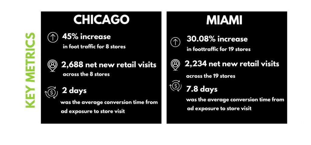 insights: the more concentrated approach in Chicago led to a higher lift in foot track over a shorter period, while Miami’s broader campaign still produced strong results over a longer timeframe, particularly in high-density areas.